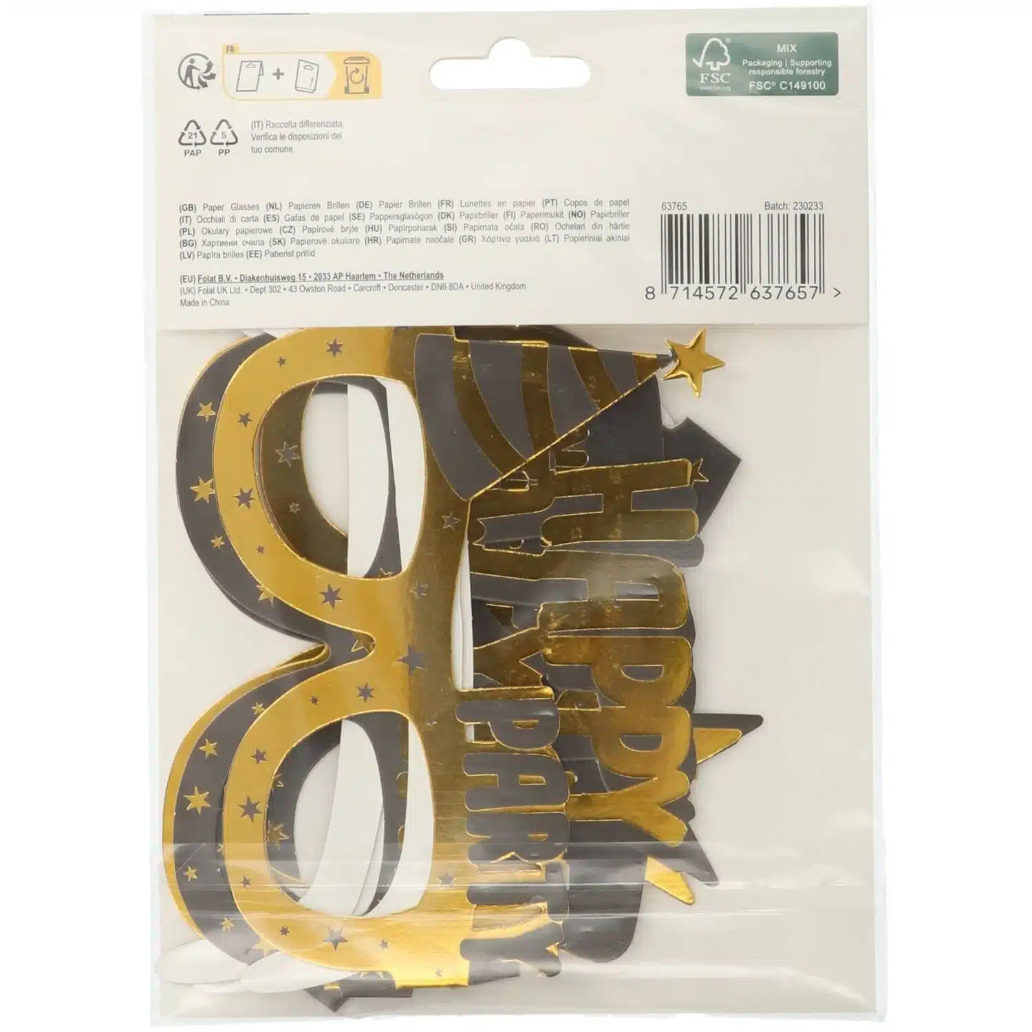 Dit is leuk vooruitkijken! Brillen Papier – BlackGold HNY worden per 6 stuks en zijn eenzijdig bedrukt. Bovenop iedere bril staan teksten als: NYE, Party, Happy New Year en Cheers. Dit artikel is gemaakt van FSC papier.