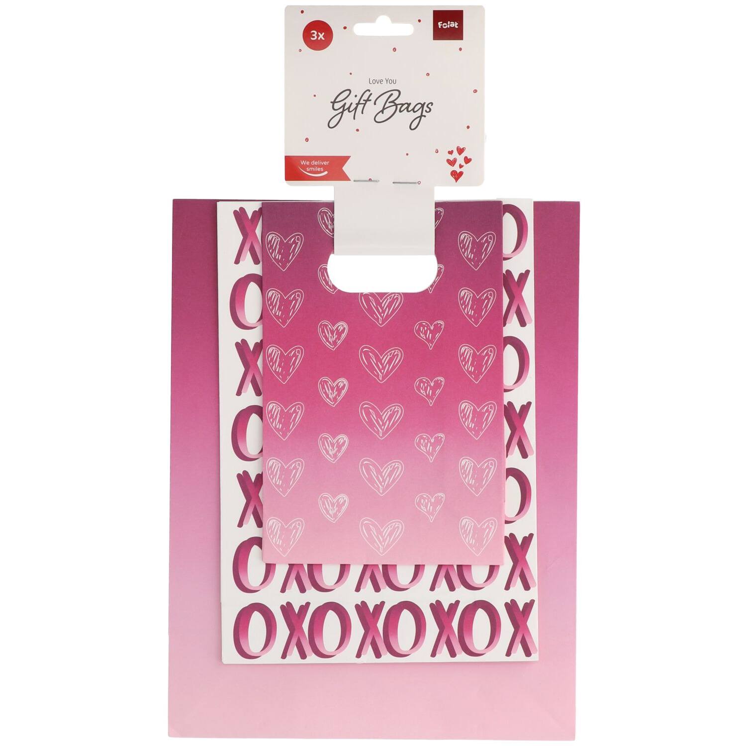 Geef liefde! Drie mooie tasjes om liefde cadeau te geven. De cadeautasjes – ombre love – 3 stuks hebben alledrie een andere maat. Het rode tasje ombre effect met witte tekst “Love You” is 27 x 20 x 10 cm groot, het witte tasje met rood ombre effect tekst “XOXOXO is 23 x 15,5 x 6 cm groot en het kleine rode tasje ombre effect met witte hartjes is 18 x 12 x 6 cm groot. Alle tasjes zijn dubbelzijdig bedrukt en zijn gemaakt van papier, zo maak je met bijvoorbeeld Valentijnsdag alleen al met goede indruk en maakt het nieuwsgierig naar wat er in zit.