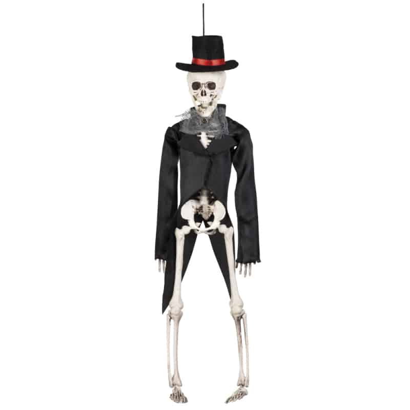 Deze hangversiering stelt een hangend skelet in bruidegomskostuum voor. Het skelet is gemaakt van duurzaam polyester en gekleed in een zwart bovenstuk met een smokingvest. De armen en benen van het skelet zijn beweegbaar. Aan de bovenkant zit een bevestigde lus zodat de Halloween pop makkelijk opgehangen kan worden. Met een lengte van 43 cm past deze decoratie gegarandeerd in uw Halloween aankleding thuis.