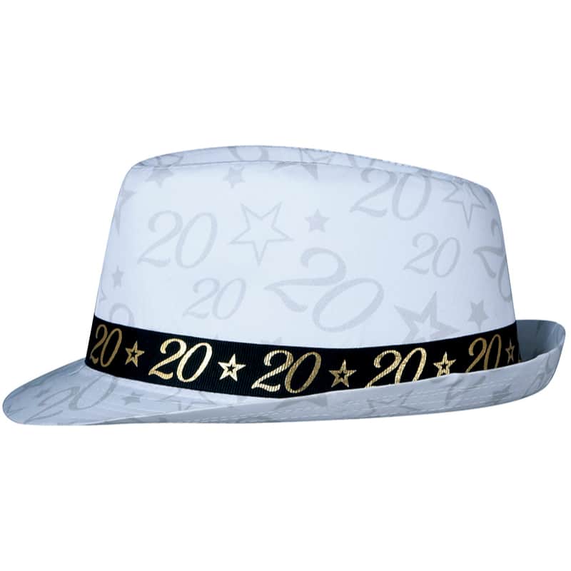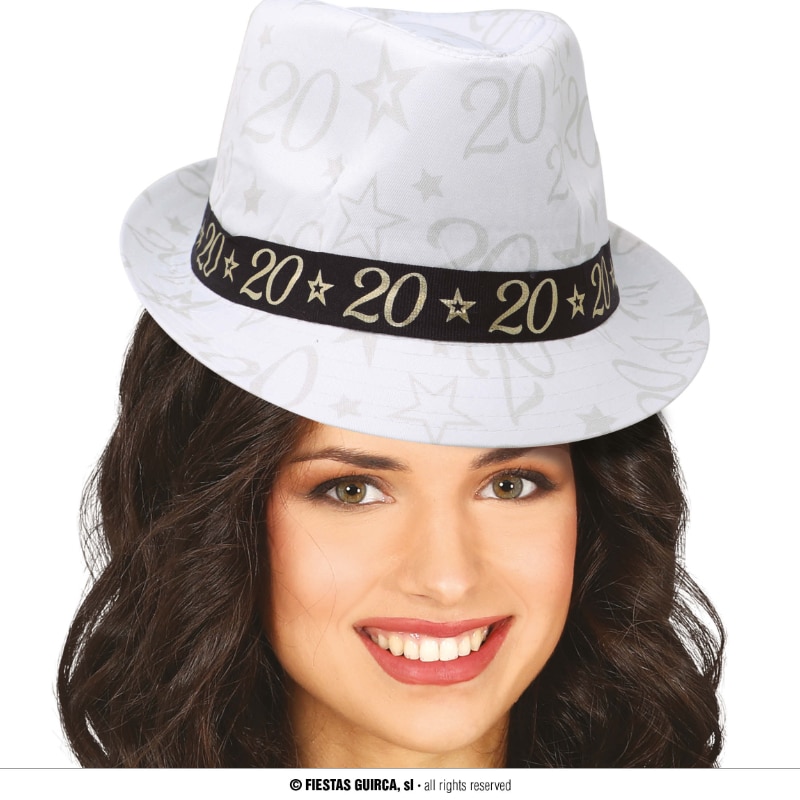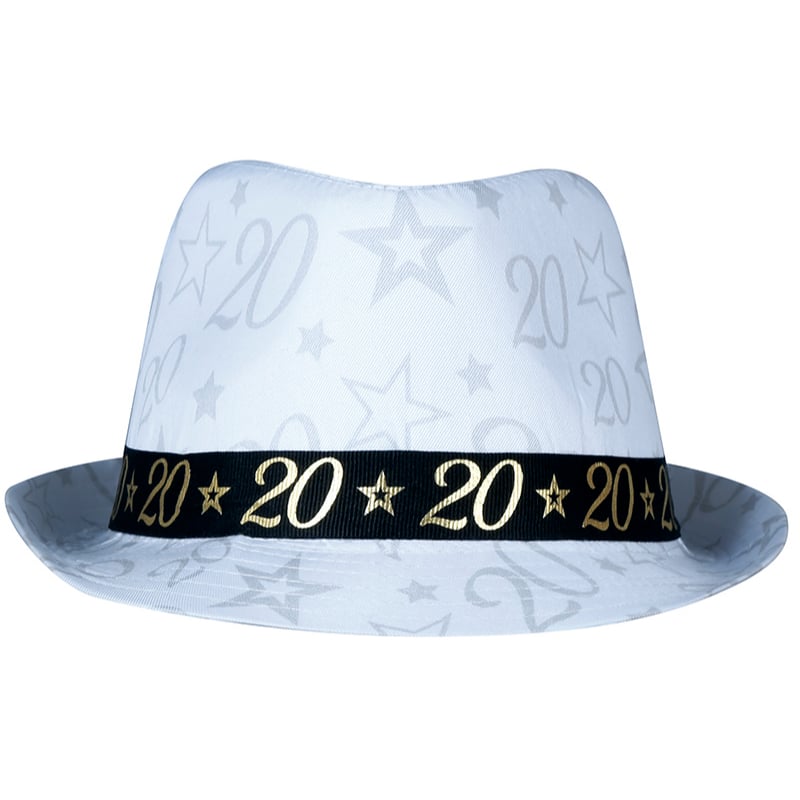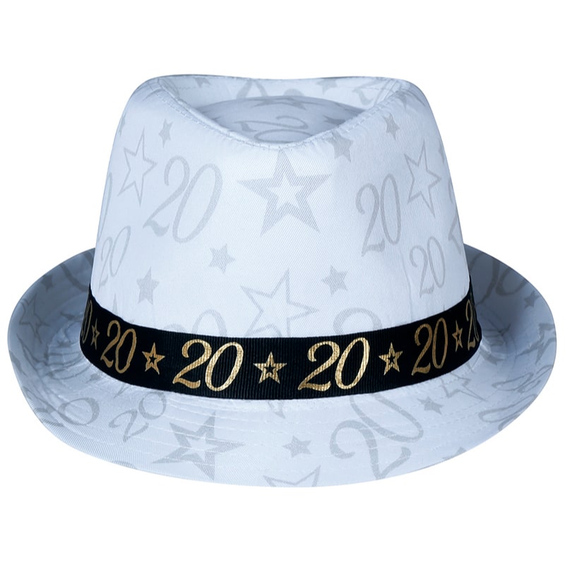 Deze stoere gangster hoed 20 jaar met sterren is wit van kleur van voorzien van diverse zilveren sterren en meerdere malen het cijfer 20 in het zilver. Om de hoed zit een zwarte rand met 20 en sterren in gouden opdruk. Op deze manier komen de stoere en de sjieke uitstralingen fantastisch samen. Deze hoed mag niet ontbreken tijdens je 20ste verjaardag of een 18 jarig jubileum