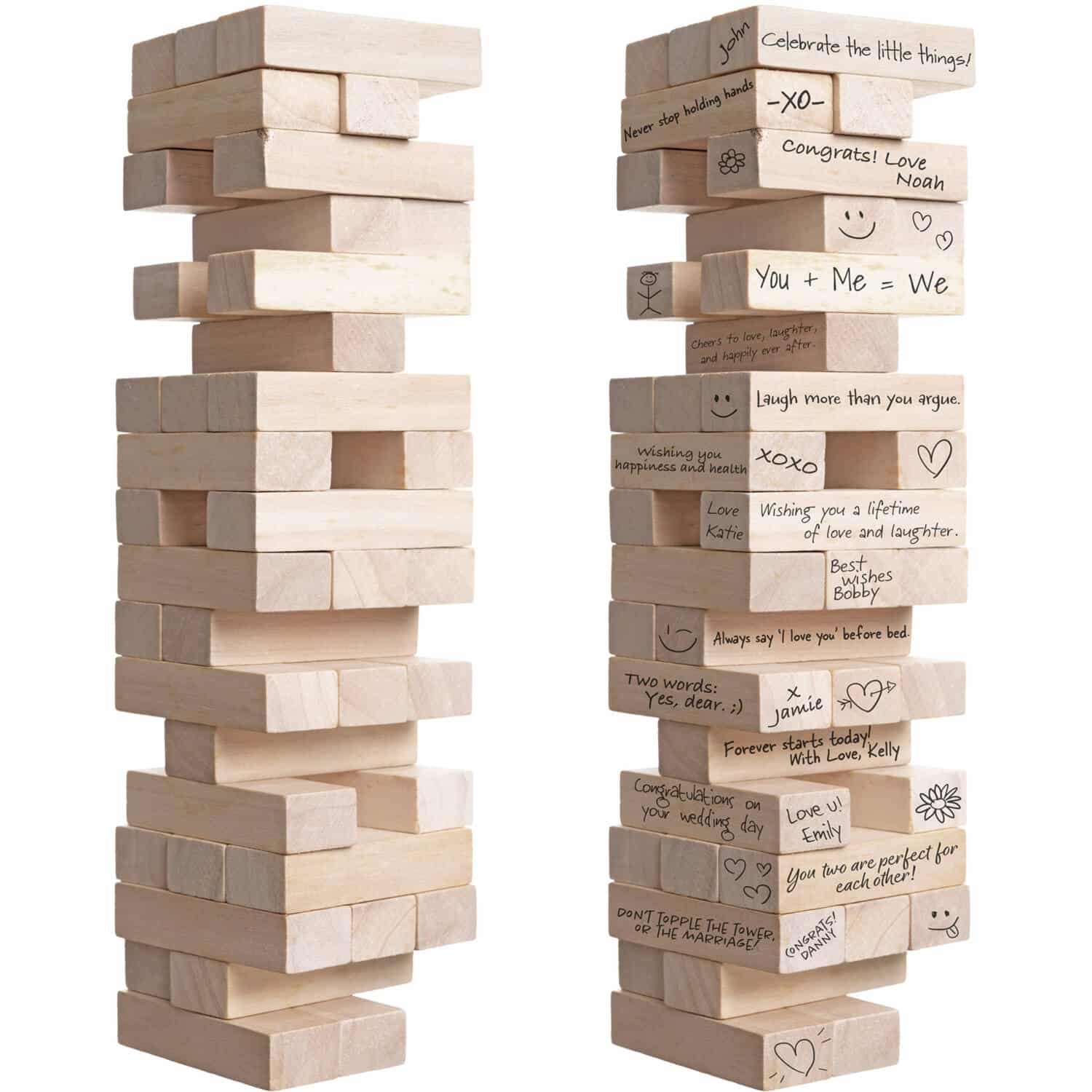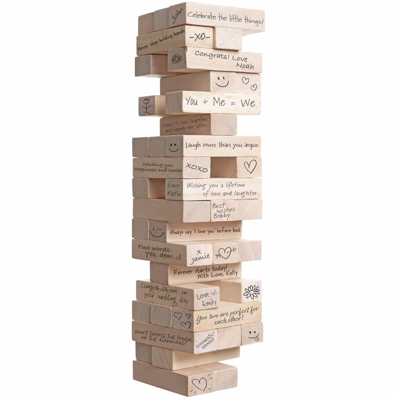 Met dit bijzondere gastenboek bouw je letterlijk herinneringen op! Een unieke twist op het traditionele gastenboek: een eigen Jenga spel vol liefdevolle wensen en woorden van dierbaren. Er zitten 51 houten blokjes van 7,5 cm x 2,5 cm x 1,5 cm in deze Jenga toren. Op elk blokje kan op elke kant iets geschreven worden. Perfect voor bruiloften, geboorte en jubilea, maar ook heel leuk als er een mijlpaal (leeftijd) wordt gevierd. Dit artikel is gemaakt van hout.
