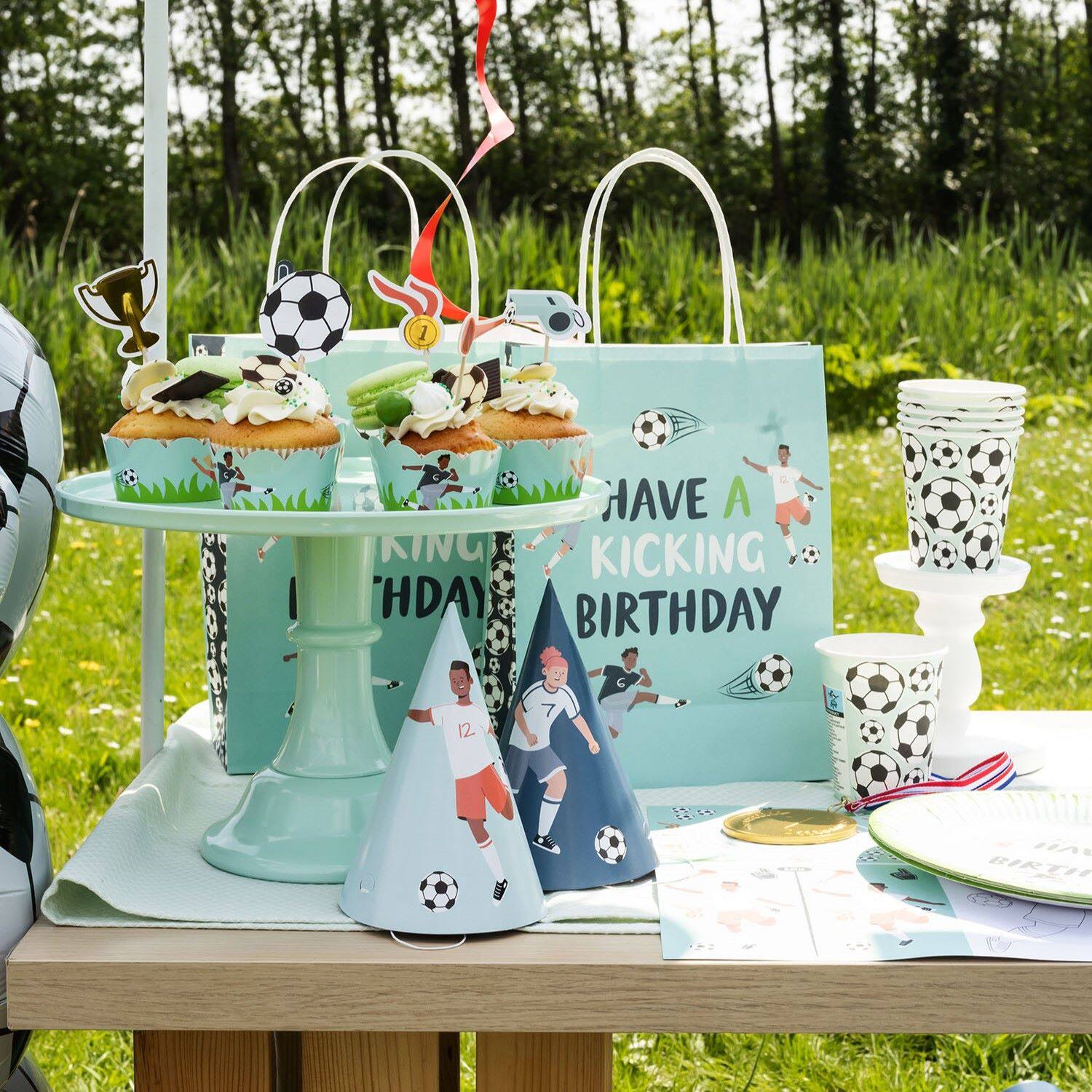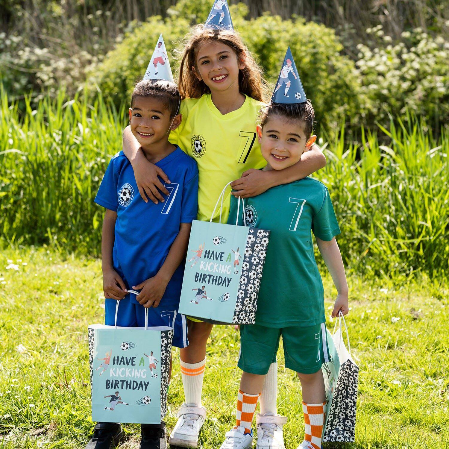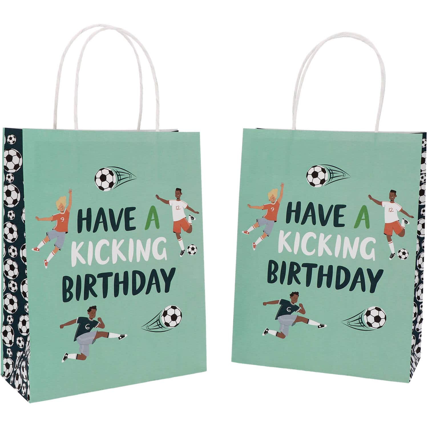 Een leuk cadeau voor alle voetballers. De vrolijke geschenktasjes – fantastic football – 20 x 27 x 1o cm en worden per 6 stuks geleverd. De tasjes zijn gemaakt van papier en zijn aan beide kanten bedrukt met de tekst “HAVE A KICKING BIRTHDAY” en drie voetballers, de zijkanten zijn bedrukt met voetballen. Inclusief hengsel zijn de tasjes ongeveer 37 cm hoog. Deze geschenktasjes mogen niet ontbreken als cadeauverpakking of als uitdeelzakje bij een jarige die houdt van voetbal.