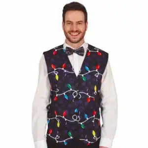 Deze leuke gilet blauw/ zwart kerstlampjes is leuk om te gebruiken bij je kerst outfit en de andere accessoires in de kleur blauw/ zwart met kerstlampjes.