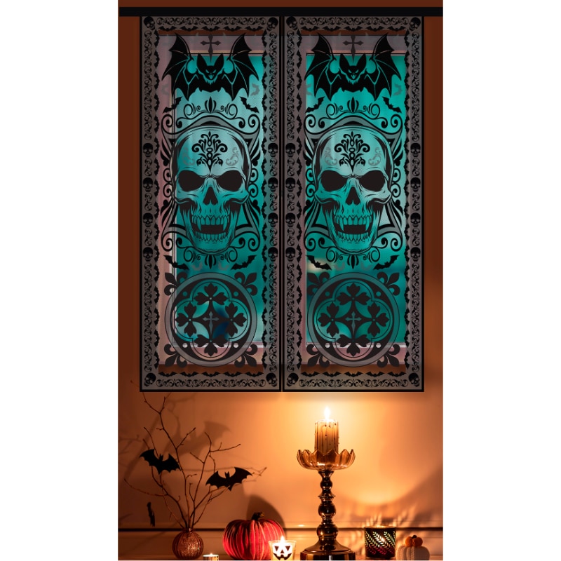 Deze gothic raamdecoratie – 102 x 213 cm mag niet ontbreken wanneer je met Halloween wilt uitpakken qua decoratie. De raamdecoratie is gemaakt van polyester en zwart van kleur. Bovenin een afbeelding van een vleermuis, daaronder een schedel en onderaan een kruis. Het ophangen van de raamdecoratie kan m.b.v. een roede.