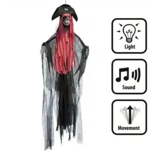 Deze piraat heeft het helemaal naar zijn zin tijdens Halloween. Hij vindt het namelijk super om mensen te laten schrikken en dat lukt zeker met zijn griezelige uiterlijk en levensechte grootte van 160 cm. Dit is niet zomaar een hangdecoratie. Deze piraat maakt ook een lachend geluid, beweegt en heeft rode oplichtende ogen.