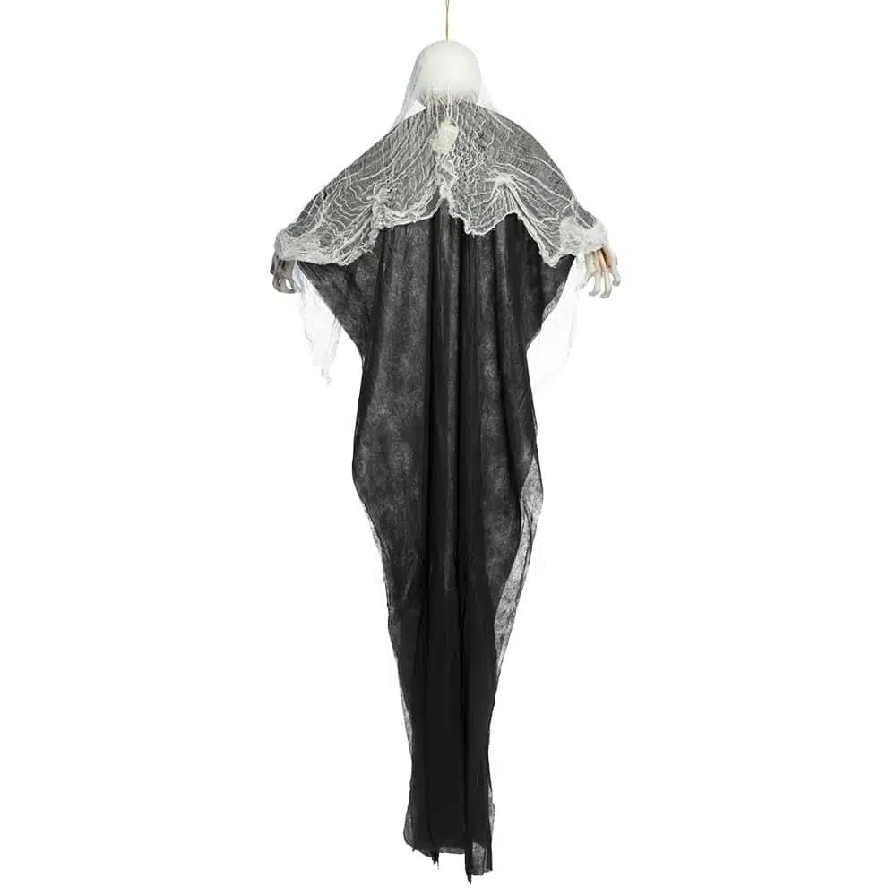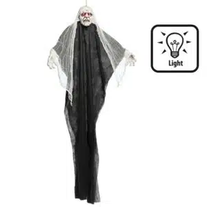 Deze griezelige oude geest zorgt zeker voor kippenvel. Zijn griezelige uiterlijk, levensechte grootte van 170 cm en flikkerende rode ogen maken dit spook de perfecte Halloween decoratie voor thuis of een spookhuis.