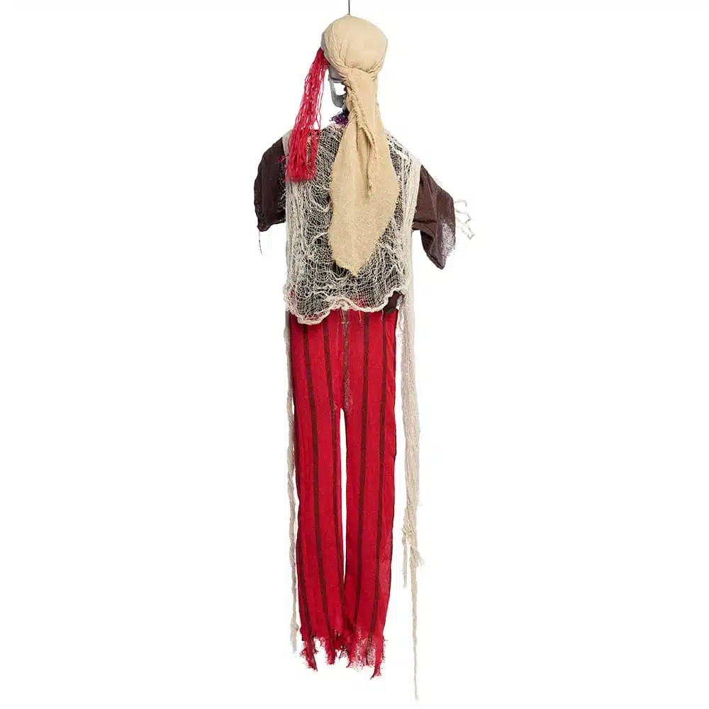Aye Aye! Kijk uit voor dit skelet van een piraat want tijdens Halloween komt hij weer tot leven. Deze leuke Halloween hangdecoratie is 160 cm lang en rode flikkerende ogen (ook al kan je het oog onder zijn ooglapje niet zien). De perfect versiering voor thuis of voor een spookhuis.