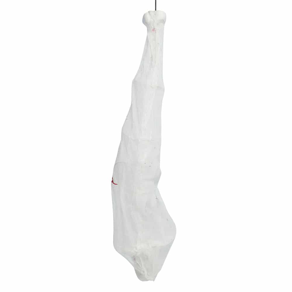 De spinnen hebben hun slachtoffer te pakken, maar tijdens Halloween komt hij weer tot leven. Dit hangende spinnenweb cocon van 165cm lang heeft een skelet erin vastzitten waarvan de ogen rood flikkeren. Een griezelige decoratie voor een halloween feest of spookhuis.