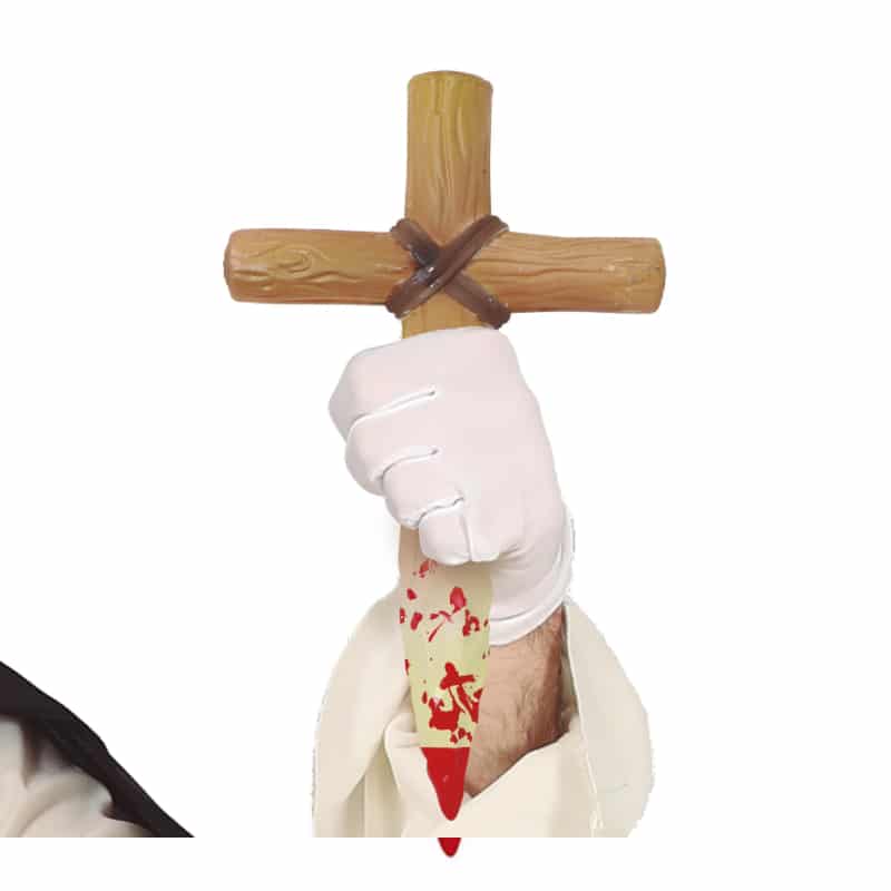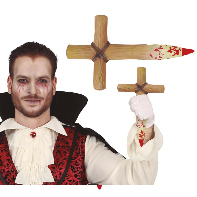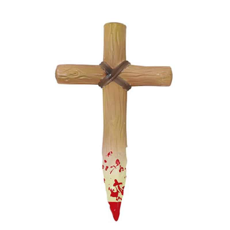 De ‘houten” kruis spijker stok – 30 cm is gemaakt van kunststof. De punt zitten ‘bloed spetters’ waardoor het heel tof is om je halloween kostuum mee aan te vullen, maar ook als aanvulling op je Halloween decoratie zeer geschikt is. Het kruis is 30 cm lang, 17 cm breed en 3 cm dik.