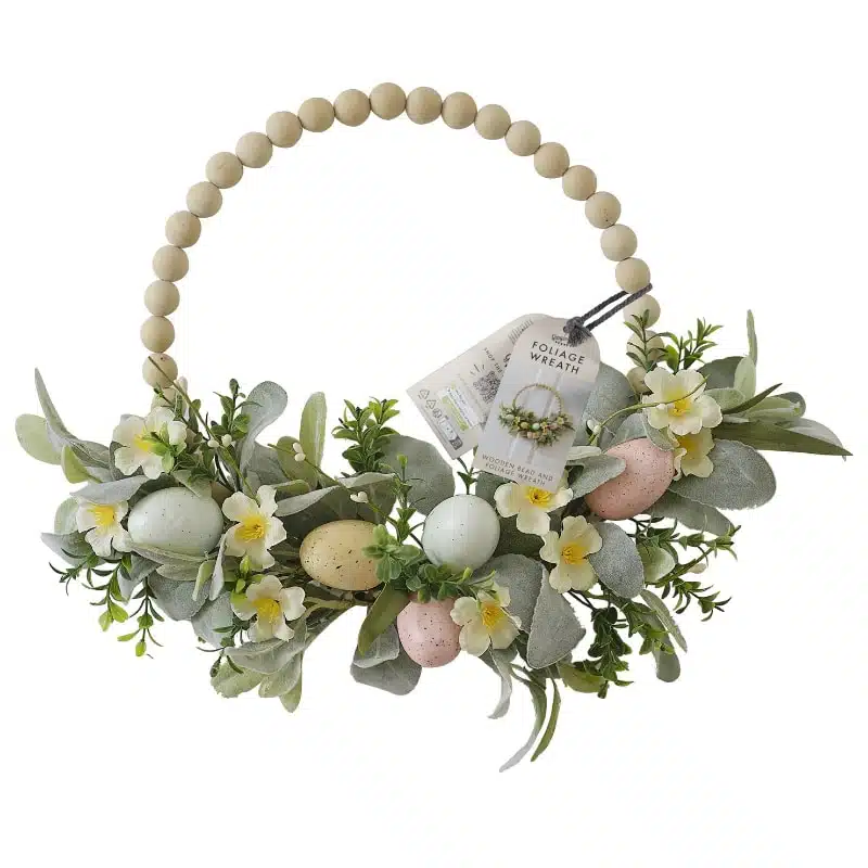 Laat je decoratie tot bloei komen met deze prachtige lentekrans met houten kralen, paaseieren en bloemen. Breng het lentefeest in huis door deze betoverende decoratieve deurkrans op te hangen – een perfecte manier om je gasten te verwelkomen. De krans straalt een vrolijke en feestelijke sfeer uit met zijn kleurrijke paaseieren en bloemendetails. Met afmetingen van 40 cm (H) x 40 cm (B) x 1 cm (D) is deze krans een opvallende toevoeging aan je interieur, waardoor je huis direct opfleurt. Laat je huis schitteren met deze prachtige lentekrans en geniet van de warme en uitnodigende sfeer die het brengt tijdens het lenteseizoen en Pasen.