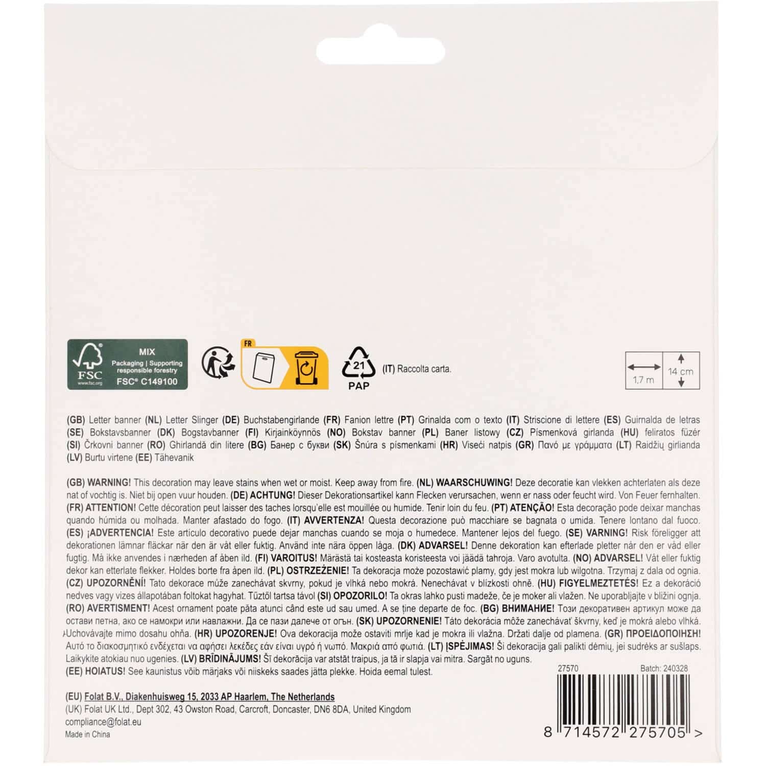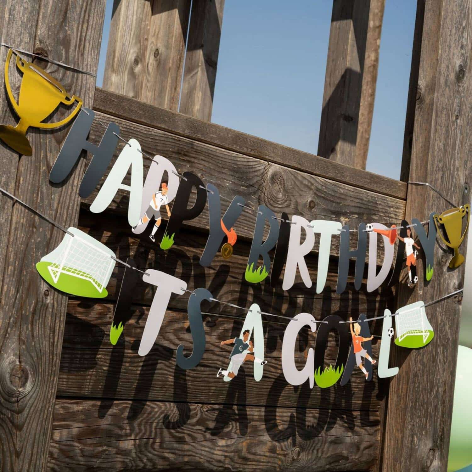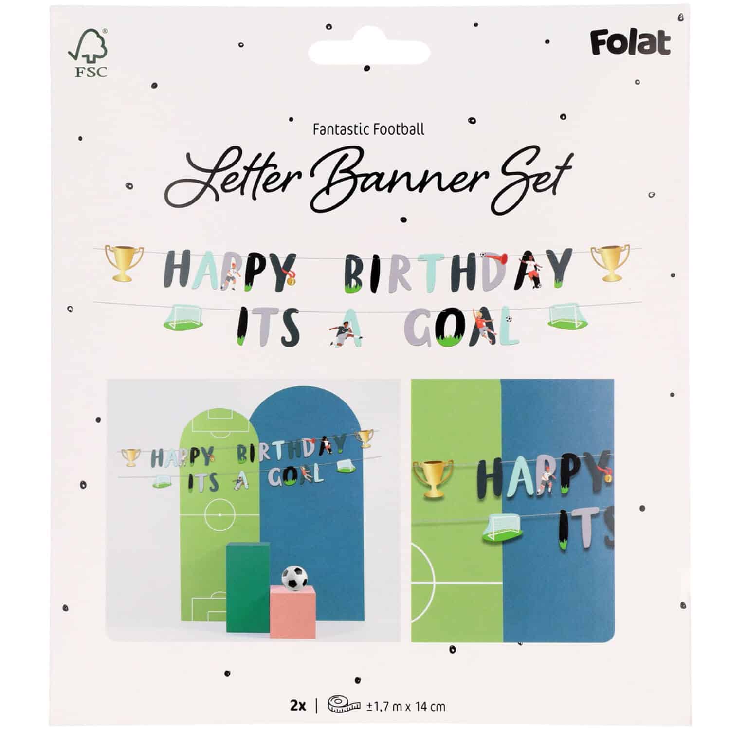 Papieren letterslinger set fantastic football 1,5 meter zorgt direct voor een feestelijke voetbalsfeer op elke verjaardag of een sportparty als het EK/ WK. Deze 1,5 meter lange letterslinger bestaat uit 2 delen en slinger met de tekst “HAPPY BIRTHDAY ” (letters ongeveer 14 cm hoog) met aan weerszijden een gouden kampioensbeker, en een slinger met de tekst “ITS A GOAL” (letters ongeveer 14 cm hoog) met aan weerszijden een voetbaldoel. De letterslinger bestaat uit drie unieke designs die perfect aansluiten bij een voetbalthema. De gouden kampioensbeker valt extra goed op dankzij een glanzende hotstamping techniek, waardoor de decoratie een luxe uitstraling krijgt. Alle letters zijn bevestigd aan een stevig lichtgrijs lint en kunnen eenvoudig heen en weer worden geschoven. Daardoor is de letterslinger flexibel op te hangen en perfect aan te passen aan verschillende ruimtes, zoals een woonkamer, tuin, feesttent of kantine.