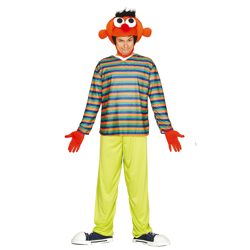 Deze toffe outfit oranje pop – maat L doet je denken aan zijn gele vriendje uit de bekendste straat van ‘Nederland’ op tv. Hij verstaat zijn vriendje nooit omdat hij (opblaasbare) banaan in zijn oor heeft. Het kostuum kan kleiner vallen.
