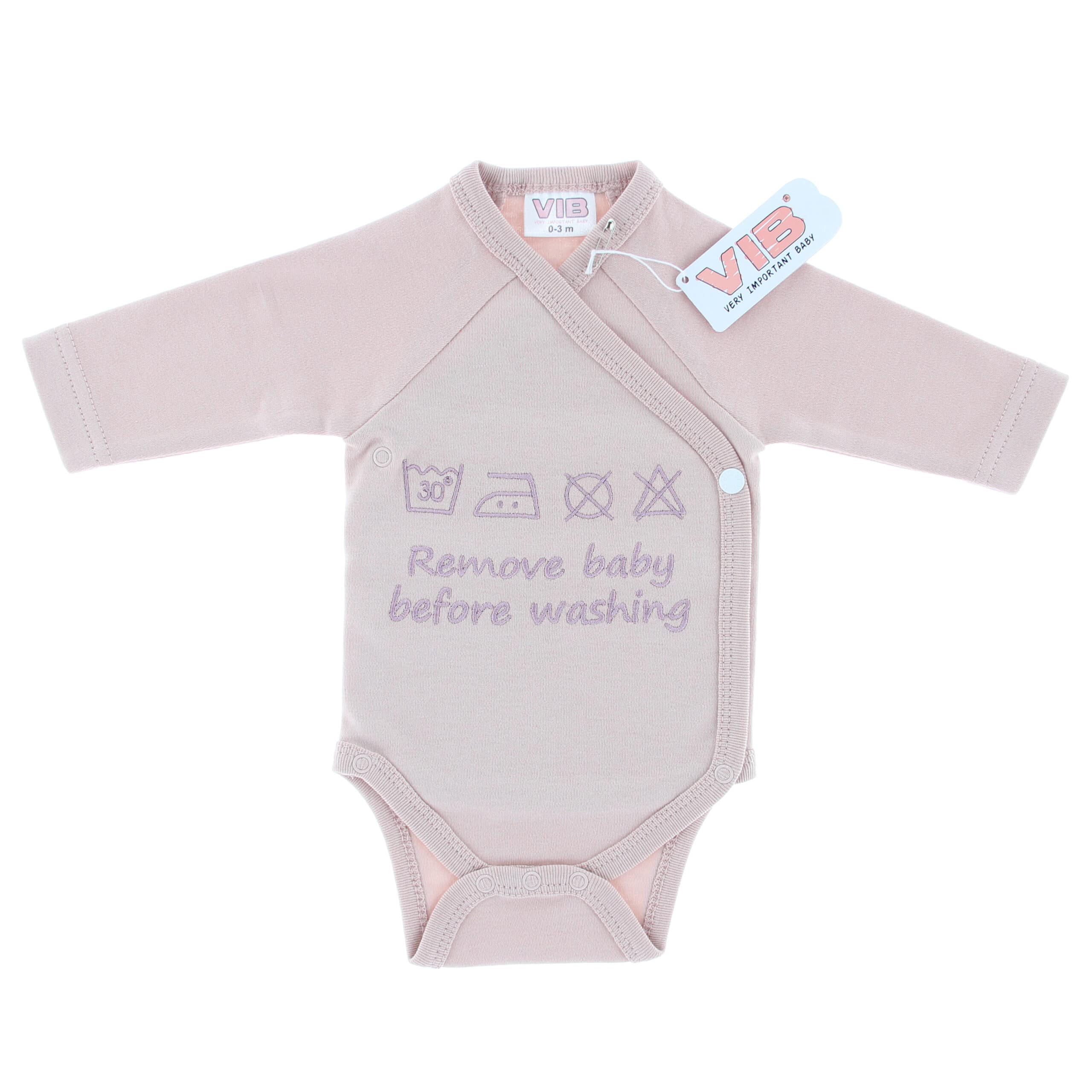 Overslag romper ‘Remove baby before washing’ – rose smoke (0-3 m)