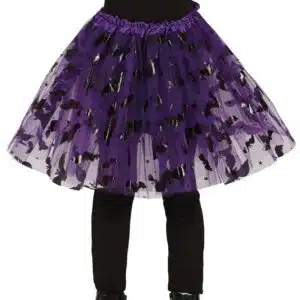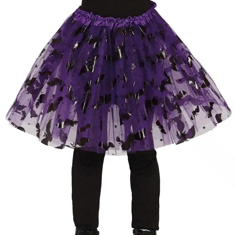 Deze paarse tutu vleermuizen maakt je prinsesje helemaal klaar voor Halloween. De tutu is gemaakt van tule (polyester), is paars van kleur bedrukt met zwart glimmende vleermuizen. Leuk om te combineren met een stoere Halloween pruik of tiara.