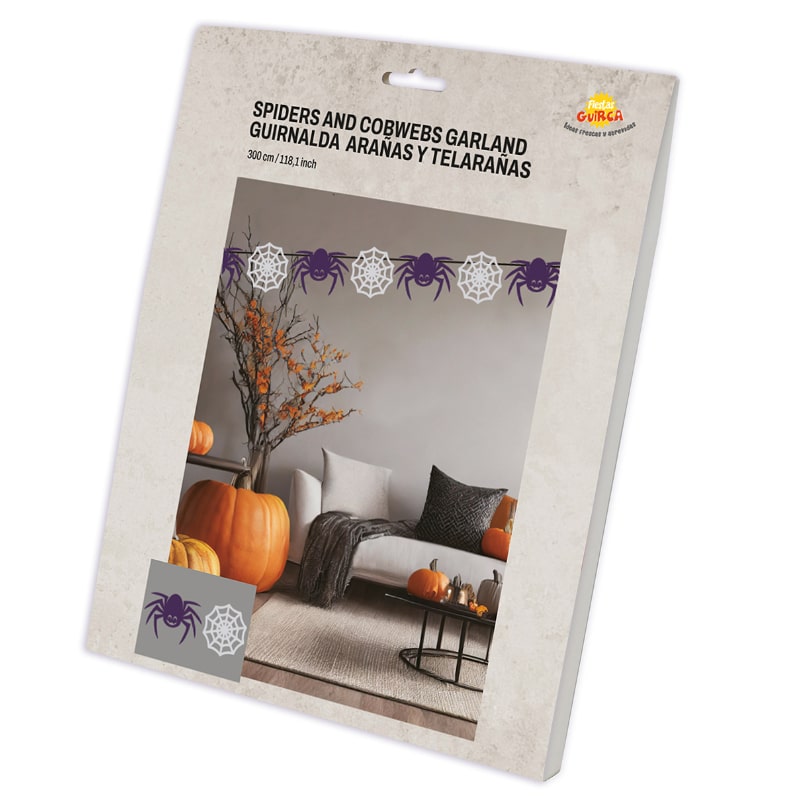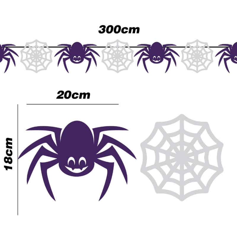 Papieren slinger spinnen en spinnenwebben – 300 cm moet je zelf in elkaar zetten. De spinnen en de spinnenwebben hebben een afmeting van 20 x 18 cm, afhankelijk van de afstand tussen de spinnen en de spinnenwebben kan de slinger 3 meter lang worden. De slinger bevat 4 paarse spinnen en zijn 4 witte spinnenwebben op een zwart lint, wanneer deze klaar is is het een mooie aanvulling op de halloween decoratie.