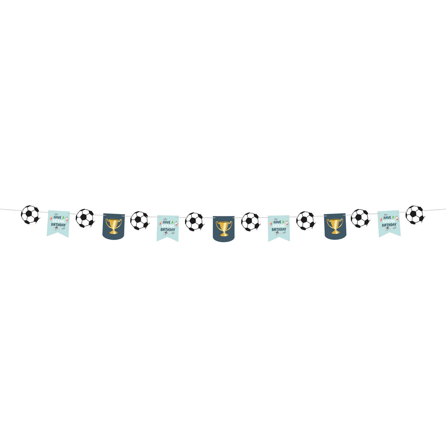 Papieren vlaggenlijn fantastic football 6 meter zorgt direct voor een feestelijke voetbalsfeer op elke verjaardag of een sportparty als het EK/ WK. Deze 6 meter lange vlaggenlijn bevat 16 dubbelzijdig bedrukte vlaggen van circa 17 x 21 cm, waardoor de decoratie vanuit elke hoek goed zichtbaar is. De vlaggenlijn bestaat uit drie unieke designs die perfect aansluiten bij een voetbalthema. Een lichte vlag met puntvorm en de tekst “HAVE A KICKING BIRTHDAY” met drie voetballers zorgt voor een speelse uitstraling. Daarnaast is er een vlag in de vorm en kleuren van een voetbal die het sportthema extra benadrukt. De donkere vlag met afgeronde hoeken toont een gouden kampioensbeker die extra opvalt dankzij een glanzende hotstamping techniek, waardoor de decoratie een luxe uitstraling krijgt. Alle vlaggen zijn bevestigd aan een stevig lichtgrijs lint en kunnen eenvoudig heen en weer worden geschoven. Daardoor is de vlaggenlijn flexibel op te hangen en perfect aan te passen aan verschillende ruimtes, zoals een woonkamer, tuin, feesttent of kantine.
