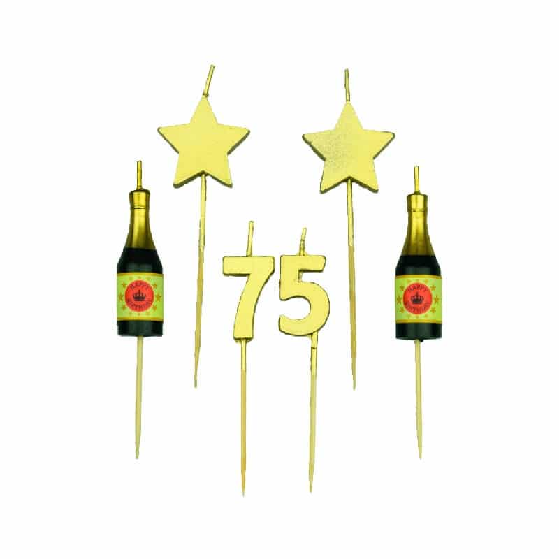 Leuke set kaarsjes bestaande 2 sterren, 2 chamganeflessen en het cijfer 75.