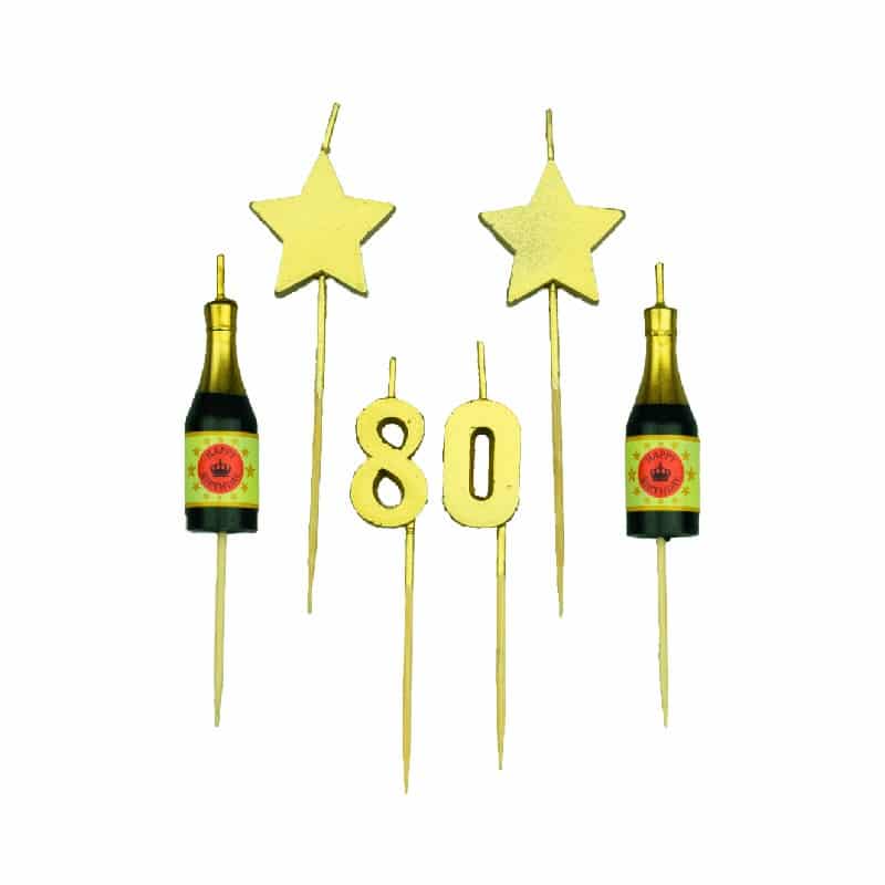 Leuke set kaarsjes bestaande 2 sterren, 2 chamganeflessen en het cijfer 80.