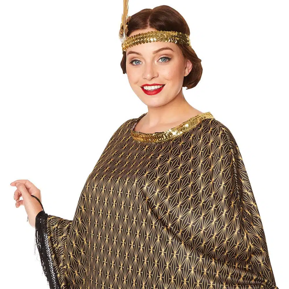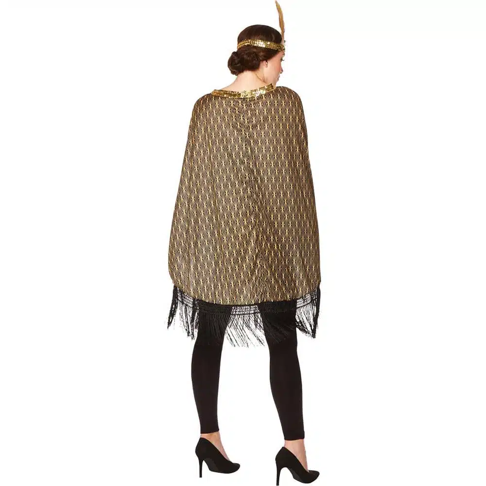 Wauw zodra je binnenstapt op elk – jaren 20 – feest steel je de show in deze Poncho Roaring 20’s. Deze goud gekleurde poncho met zwarte franjes is leuk om te combineren met een zwarte boa, deze wordt niet meegeleverd, en/ of accesoires passend bij het kostuum.