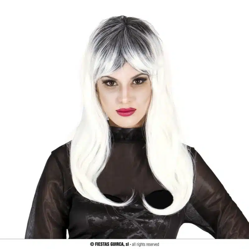 Deze pruik zombie wit zwart hoef je niet alleen te dragen als je met Halloween verkleed gaat als zombie of heks, maar is ook tof bij elk ander verkleedthema.  Deze pruik zombie wit lang haar met een beetje zwart is gemaakt van synthetisch haar.
