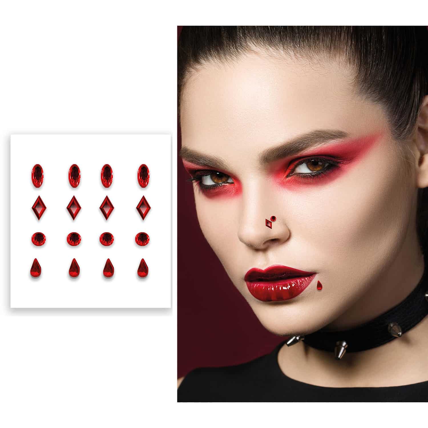 Wauw met deze toffe rode plakdiamantjes fake piercing steel je de show op elk jaren Halloween feest. Combineer deze jewel face stickers met schmink van bijvoorbeeld Superstar, om een geweldig effect te creëren. Met schmink penselen en benodigdheden kun je m.b.v. sponsjes zorgen dat de huid goed schoon is en een penseel kan wellicht helpen met het beter aandrukken van de gezichtsjuwelen. De stickers worden niet aanbevolen op een gevoelige huid.