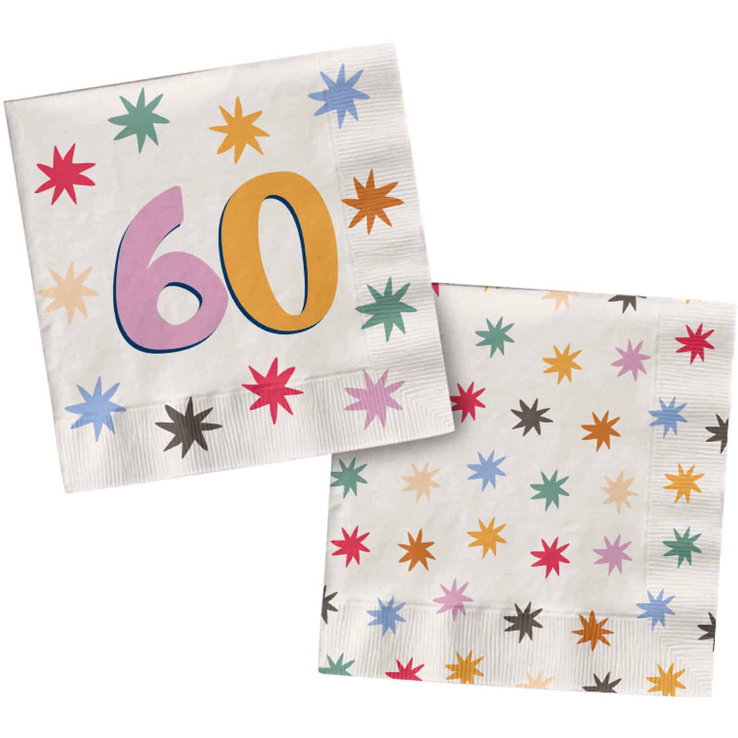 Maak je 60-jarig jubileumfeest compleet met de stijlvolle Servetten Starburst 60, een essentieel element voor een feestelijke tafelsetting. Deze servetten, met een prachtig ontwerp, voegen een vleugje elegantie toe aan elke viering. De servetten zijn verpakt per 20 stuks en zijn 33×33 cm.