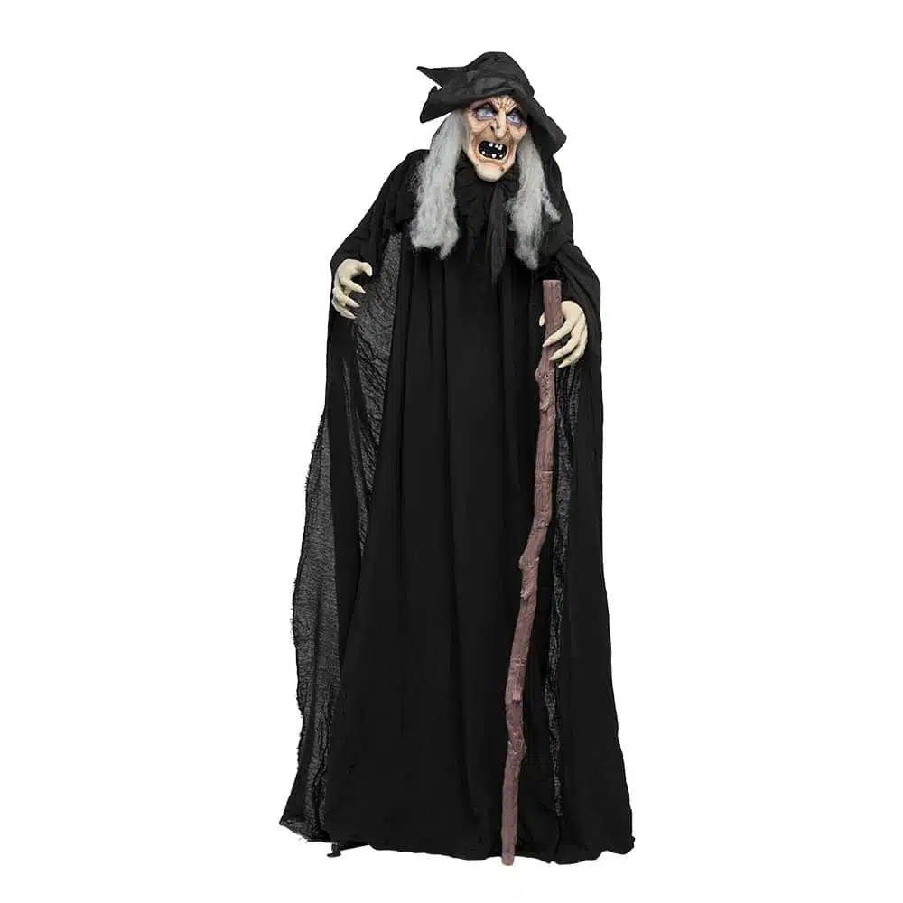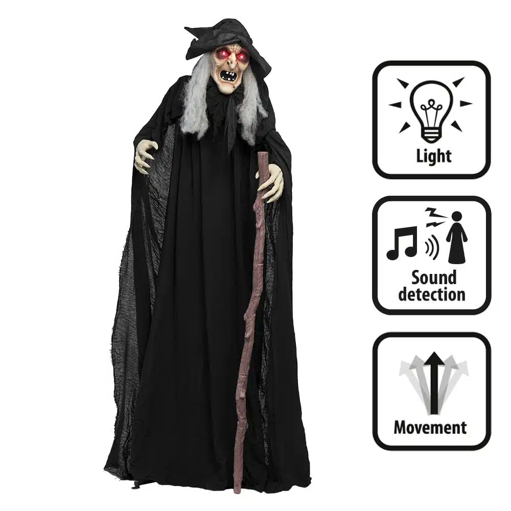 Deze kwaadaardige heks staat klaar om iedereen de horror van Halloween te laten zien. Ze wordt geactiveerd op basis van geluid, dus kom niet te dichtbij anders zal ze je zeker beheksen. De heks heeft een levensechte grootte en verschillende interactieve functies zoals bewegingen, enge geluiden en oplichtende ogen. Perfect als versiering voor Halloween of een spookhuis.
