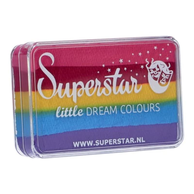 Ontdek de superstar aqua face – and bodypaint – little dream colour rainbow – 30 gr met de kleuren roze, donker roze, geel, blauw en paars. Deze waterschmink is perfect voor het creëren van koninklijke schminkontwerpen. Een dunne laag van deze schmink is voldoende om een dekkende basis op te zetten. Het droogt snel op en geeft niet af. Hoewel het product in het potje scheurtjes kan vertonen en de kleuren kunnen mengen, heeft dit geen invloed op de kwaliteit en werking van de schmink. De Superstar Little Dream Colours kunnen eenvoudig worden aangebracht met een spons of penseel, waardoor je moeiteloos een prachtig resultaat kunt creëren. Het regenboogeffect van de kleuren die in elkaar overlopen zal zeker indruk maken.