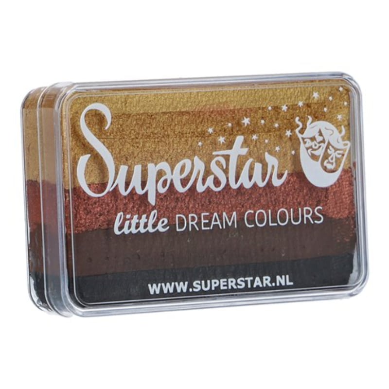 Ontdek de superstar aqua face – and bodypaint – little dream colour safari – 30 gr met de kleuren zwart, bruin, koper en goud. Deze waterschmink is perfect voor het creëren van koninklijke schminkontwerpen. Een dunne laag van deze schmink is voldoende om een dekkende basis op te zetten. Het droogt snel op en geeft niet af. Hoewel het product in het potje scheurtjes kan vertonen en de kleuren kunnen mengen, heeft dit geen invloed op de kwaliteit en werking van de schmink. De Superstar Little Dream Colours kunnen eenvoudig worden aangebracht met een spons of penseel, waardoor je moeiteloos een prachtig resultaat kunt creëren. Het regenboogeffect van de kleuren die in elkaar overlopen zal zeker indruk maken.