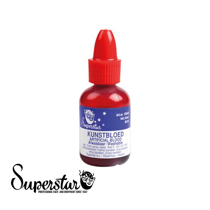 Het Superstar Nep Bloed, Hel Rood Dik stollend is een mooi en helder kunstbloed. Het is vrij dik en blijft mooi op de aangebrachte plek zonder uit te lopen en kan gebruikt worden voor het maken van bloederige wonden. Het bloed stolt. Door licht en donker bloed te combineren creëer je een mooi resultaat. Ideaal voor wonden en Halloween.