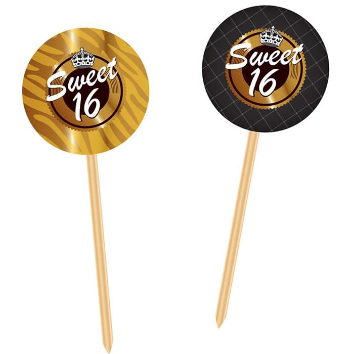 Met deze leuke party prikkers maak je jouw Sweet 16 compleet! De party prikkers zijn zwart met goud met een kroontje. De party prikkers zijn per 20 stuks verpakt. De party prikkers zijn erg leuk om te combineren met onze andere producten uit de Sweet 16 lijn.