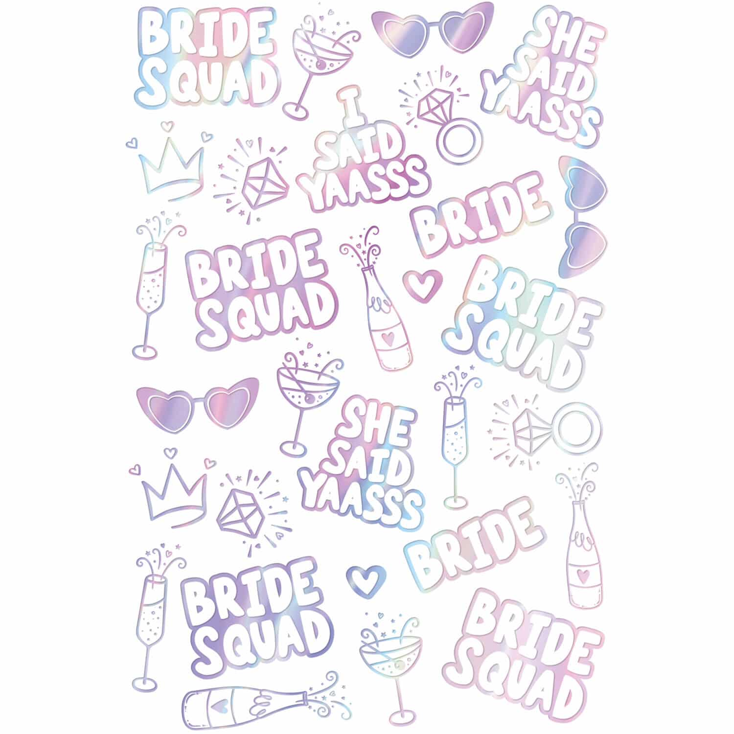 Helemaal in stijl met deze tattoos – she said yaasss , het wordt geleverd als 1 vel met 30 tatoeages. Deze iriserende nep tattoos zijn leuk om bijvoorbeeld de vrijgezellenavond compleet te maken. Er zitten totaal 30 tattoos op het vel: “I SAID YES”, “BRIDE”, “BRIDE SQUAD”, kroontjes, diamanten, cocktails, hartvormige brillen, sterretjes, champagneflessen en glazen champagne. Deze iriserende nep tattoos zijn gemaakt van tattoo lijm, papier en OPP.