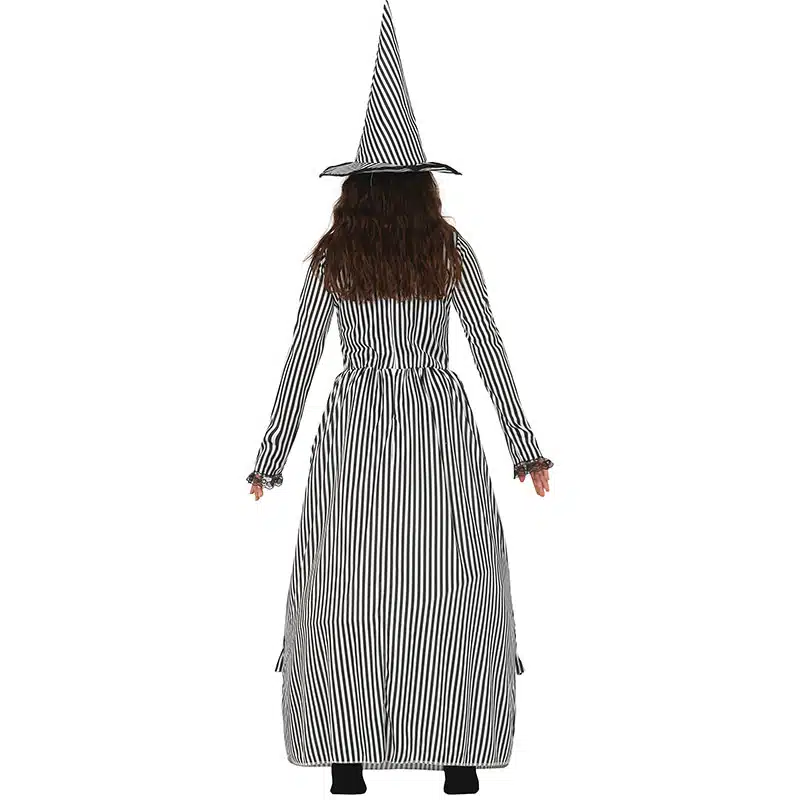 Deze elegante Vintage witch dames jurk is zwart en wit gestreept van kleur. Deze jurk heeft de naam vintage, maar het is geen tweedehands jurk. Het type jurk lijkt op de jurken uit de jaren ’70 en jaren ’80 wat weer helemaal terug is van weggeweest. De jurk wordt geleverd inclusief de heksenhoed.