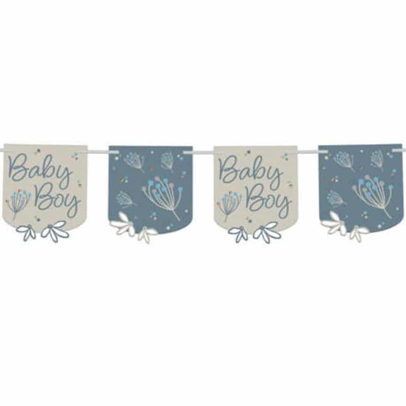 Een feestelijke vlaggenlijn voor een babyshower, een gender reveal en/ of een geboorte van een jongen. Nieuw leven is tenslotte altijd een feest dat vraagt om mooie decoratie. Deze vlaggenlijn blooming baby boy is totaal 6 meter lang. De vlaggen kunnen heen en weer worden bewogen over het witte lint. Op de witte vlag staat in blauwe schrijfletters “Baby Boy” en op de blauwe vlag het blooming baby patroon.  Dit artikel is gemaakt van FSC papier.