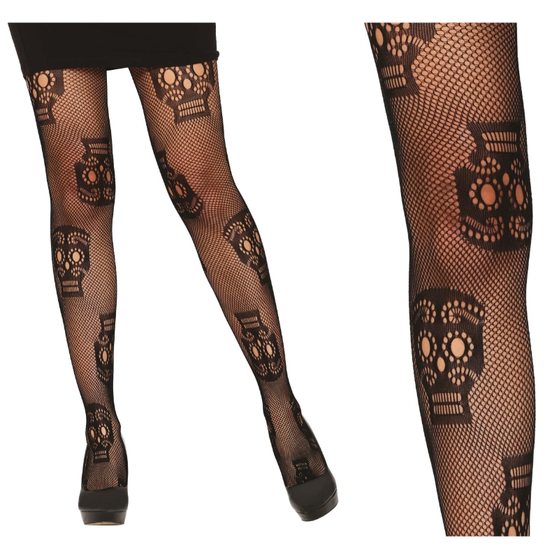 Deze volwassen netpanty skulls zwart van kleur en gemaakt van een rekbare stof. De maat is one size – dit suggereert dat iedereen het aan zou kunnen – echter is deze maat helaas niet voor iedereen geschikt, daar de panty een lengte van ongeveer 150 cm heeft. De panty is geschikt om te dragen onder een kostuum met Halloween, een themafeest of carnaval.