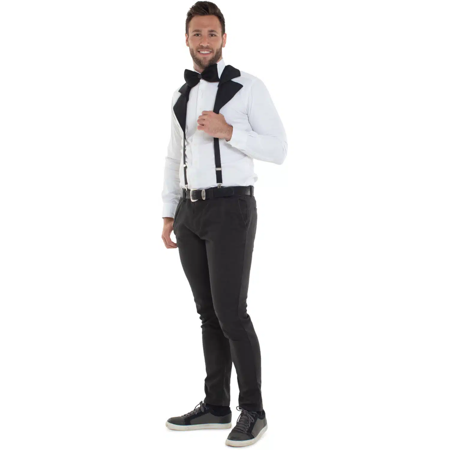 Wauw met deze bretels is het net alsof je een smoking aan hebt. Deze zwarte smoking bretels volwassenen worden met strik geleverd. De bretels zijn er in 1 maat – one size fits most – en zijn gemaakt van polyester. Leuk om te dragen op een wit overhemd of onder een colbert.